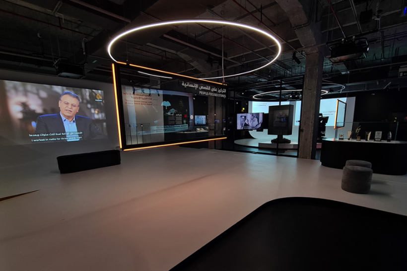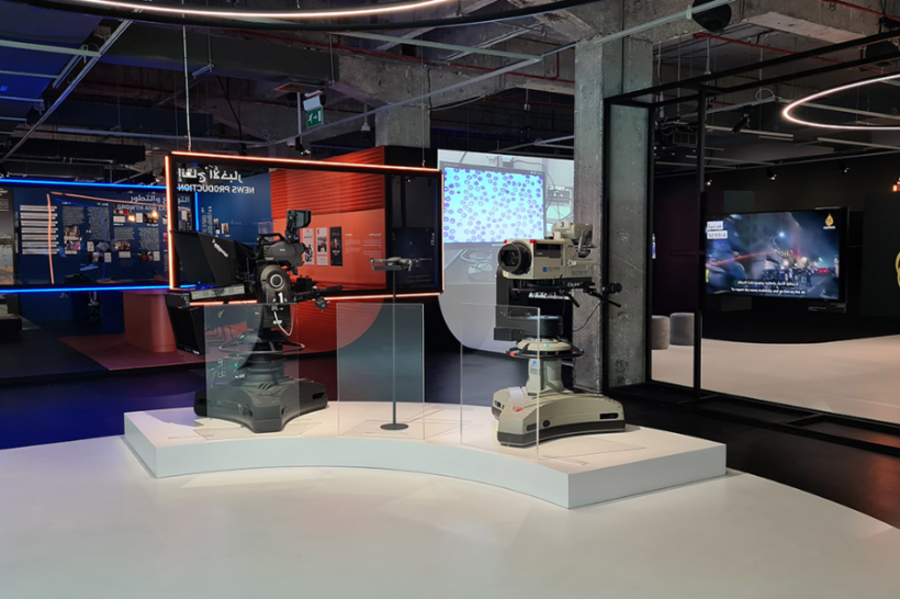 The exhibition, which occupies an area of 780 m2 plus 125 m2 in the courtyard of the Fire Station in Doha, traces the evolution of the Al Jazeera Media Network into a global news powerhouse. The design is a walk through the 25-year history of the TV channel from its beginnings until its present-day multi-media offerings. The exhibition displays objects related to broadcast technology, such as cameras. It also displays Al Jazeera’s Wall of Ethics and the awards it has won over the years.