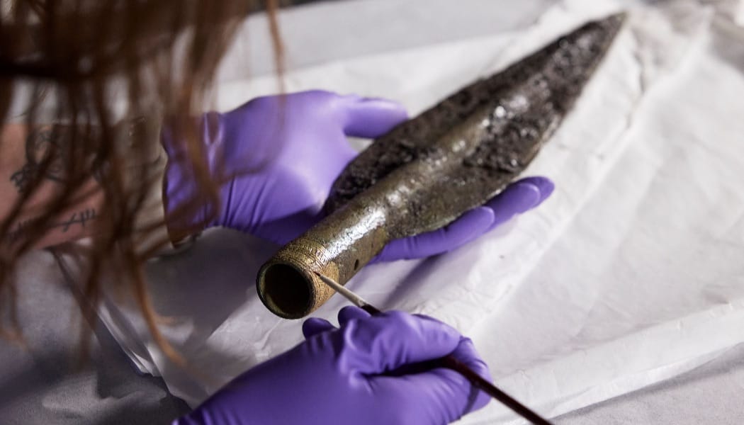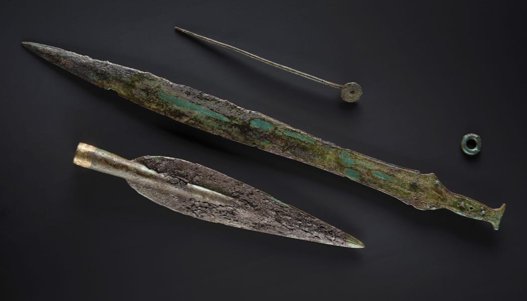The hoard includes a rare spearhead decorated with gold and a bronze sword in a wooden scabbard, dating from around 1120-920 BC. The spearhead has an intricately decorated gold-bound socket, representing one of only two such examples known from Scotland. It was discovered alongside a bronze sword with an unusual lead-tin pommel, still sheathed in the remains of a wooden scabbard.