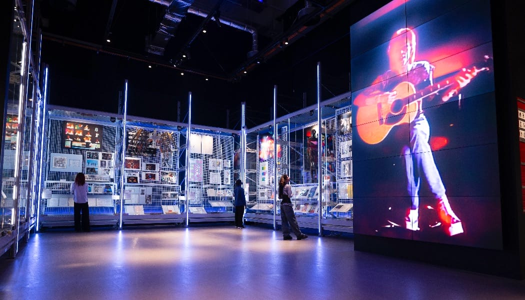 The centre also incorporates overhead storage of twenty costumes in visible hanging bags, a film showing performances and videos, and an interactive installation, The Library of Connections, mapping Bowie’s cultural influence.