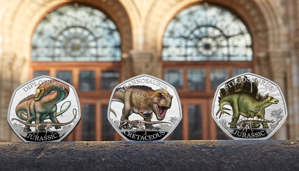 Image: Dinosaur coins from The Royal Mint (c) The Trustees of the Natural History Museum, London 2023. All Rights Reserved.
