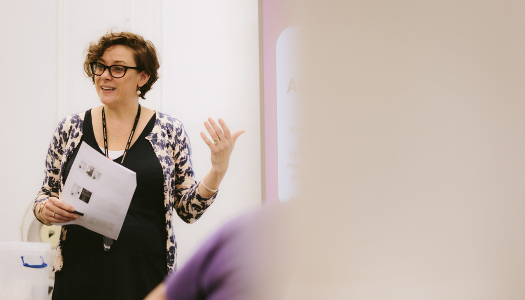 Image: A woman talking to a group as part of a museum workshop (TWAM)
