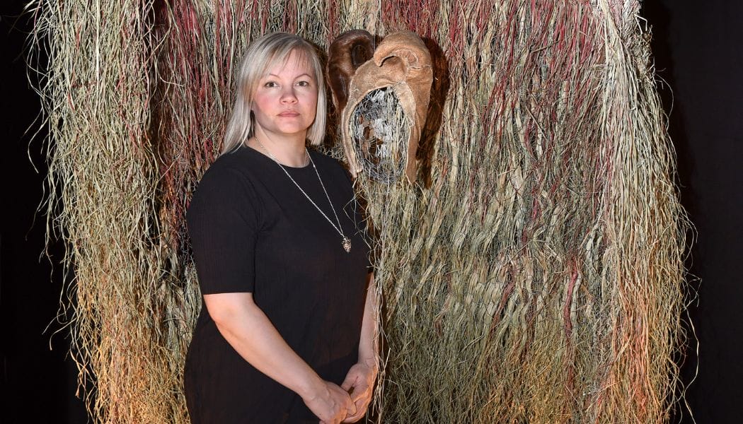 Image: Máret Ánne Sara with her artwork at the exhibition Environmental Injustice - Indigenous Peoples' Alternatives (at Musée d'ethnographie de Genève (MEG), © Johnathan Watts, MEG